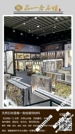 福建省泉州品一石材有限公司(品牌:五洲品一)座落在聲譽(yù)海內(nèi)外賦有“世界石都”的福建省泉州市水頭鎮(zhèn)濱海大道鵬翔石材城內(nèi),集山水畫大板及荒料交易一條龍服務(wù)。公司成立于2018年,是一家集設(shè)計(jì)、生產(chǎn)、貿(mào)易為一體的創(chuàng)新型企業(yè)。\\\