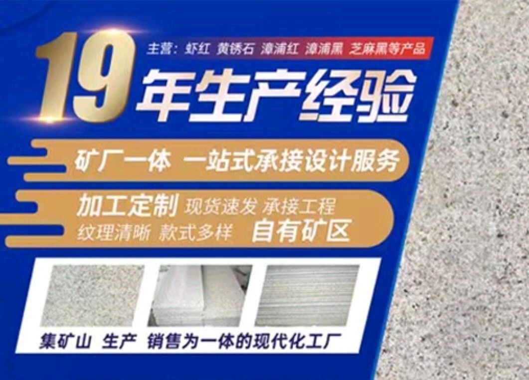 漳浦縣鴻勝石材有限公司是一家集礦山開(kāi)采、自營(yíng)加工生產(chǎn)、自主產(chǎn)供銷為一體的石業(yè)公司,公司擁有數(shù)家生產(chǎn)基地、手工加工場(chǎng)、大型礦山。公司創(chuàng)業(yè)歷程10年,憑著豐富的加工生產(chǎn)經(jīng)驗(yàn)、雄厚的技術(shù)力量和先進(jìn)的設(shè)備,產(chǎn)品遠(yuǎn)銷歐美、韓國(guó)、新加坡、臺(tái)灣等地,深受客戶的信賴與好評(píng)。 本公司產(chǎn)品主要有: 漳浦紅,漳浦黑,漳浦青,漳浦蝦紅,漳浦銹石,福建青,安山巖,芝麻黑,芝麻灰,沙漠棕等。