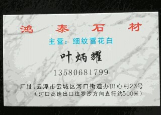 云浮鴻興石材主營產(chǎn)品:松香黃,松香啡,松香玉,松香玉1,冰花玉,冰花玉2,冰花玉3,紅龍玉6,藍(lán)冰玉3,藍(lán)冰玉2,意大利水晶藍(lán),白水晶,藍(lán)水晶(花崗巖),白冰玉,0°灰,18度灰,0°冰白企業(yè)地址:廣東云浮云城區(qū)河口馬港開發(fā)區(qū)南側(cè)